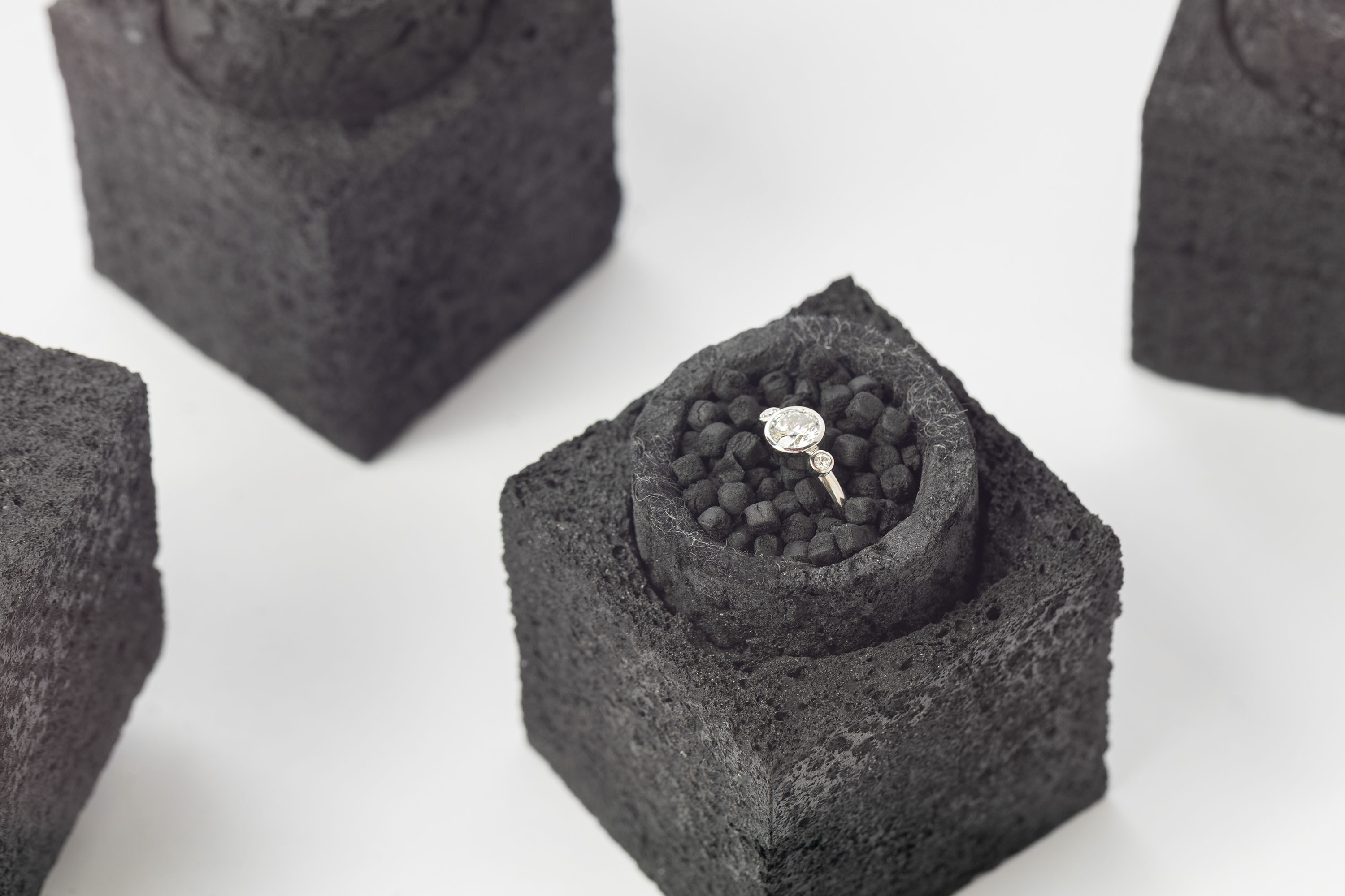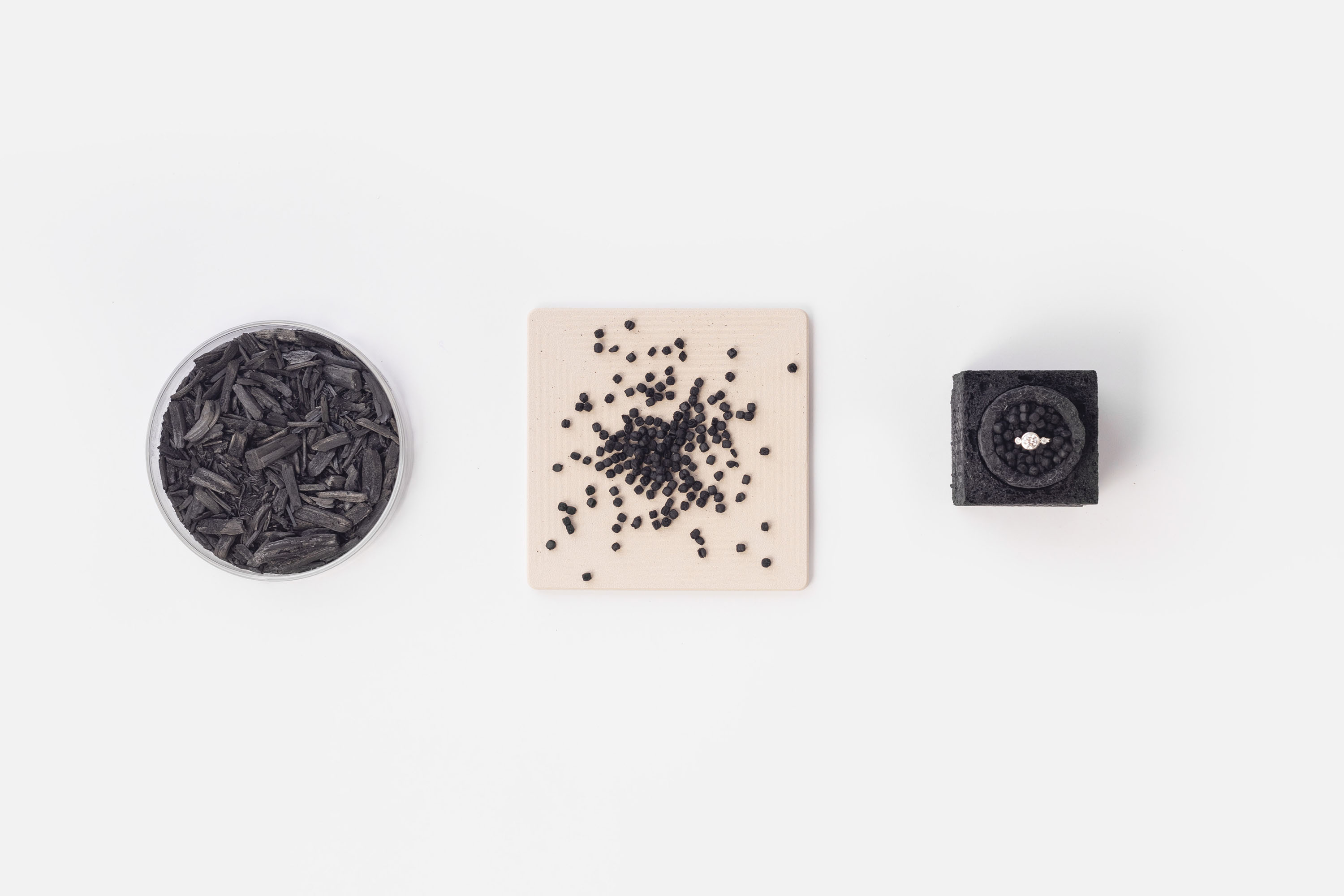 Question - Why shouldn’t yesterday’s waste serve us today, and tomorrow? By placing Carbon Cell alongside its purest counterpart, the diamond, people are challenged to reflect on the conventional notions of value. This juxtaposition, represented in a bold, geometric jewellery box, invites a deeper reflection on material worth, beauty, and the potential hidden in what is too often discarded.