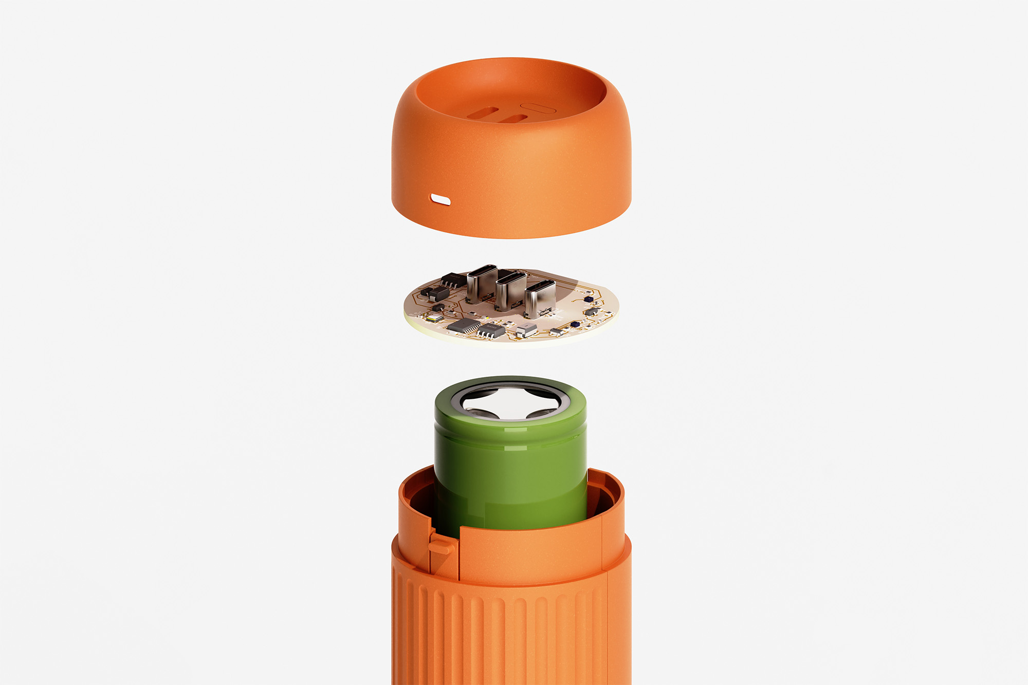 Bamboo-O has the potential to be disposed of in a way that will never persist on our earth providing the housing can be disassembled from the components inside. Designing a power bank that could be intuitively separated became essential. Inspired by the snap-fit mechanism used in Wild deodorant packaging, visible snaps were integrated into either end of the device. These could be pressed with a teaspoon or similar object, allowing the body to slide apart and reveal the battery and a simple PCBA. Each component was designed with its own end-of-life pathway. The outer casing can be buried in the garden or placed in a home composter, where it will degrade within 18 months. The battery can be dropped off at a local supermarket collection point, and the PCBA sent via a small free-return envelope for e-waste recycling.